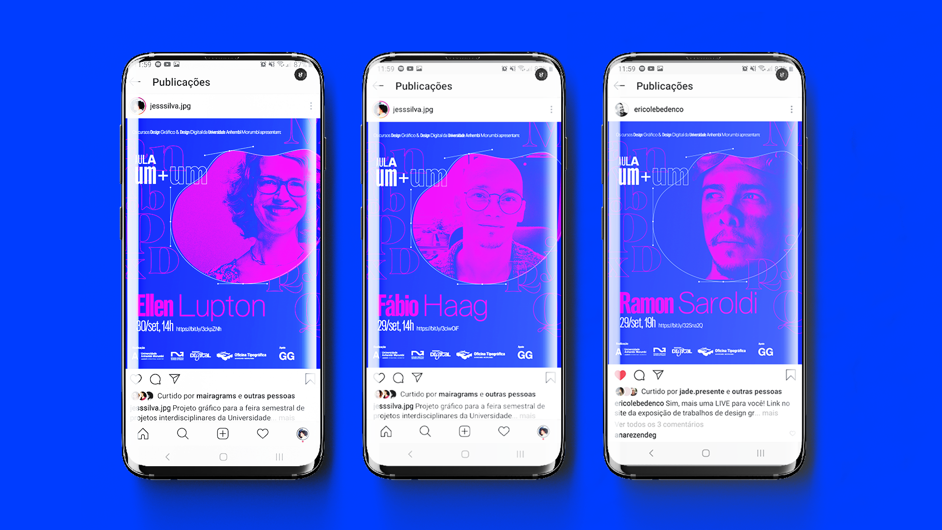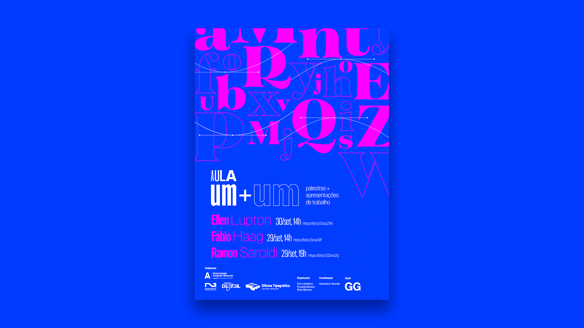 O Aula 1 é o evento que abre o semestre dos cursos de Design Gráfico e Design Digital da Universidade Anhembi Morumbi. No segundo semestre de 2020, produzi uma proposta de identidade visual para a edição em questão. Infelizmente essa opção não foi aprovada, mas fiquei satisfeito com o resultado. Essa edição do evento contou com um enfoque especial em assuntos mais voltados a Tipografia: Ellen Lupton, uma das principais pesquisadoras de design gráfico e tipografia do mundo, e Fabio Haag, um dos designers de tipos com maior relevância e visibilidade no mercado nacional e internacional de tipos digitais, foram dois dos três convidados do evento. Portanto, desenvolvi uma identidade em que os principais elementos fossem formados por tipos, brincando com as possibilidades de duas famílias tipográficas de designers brasileiros: Tenez, da Plau (ilustração e grafismos), e Grotesca Reforma, resgate tipográfico de Cadu Carvalho (informações gerais das peças desenvolvidas).