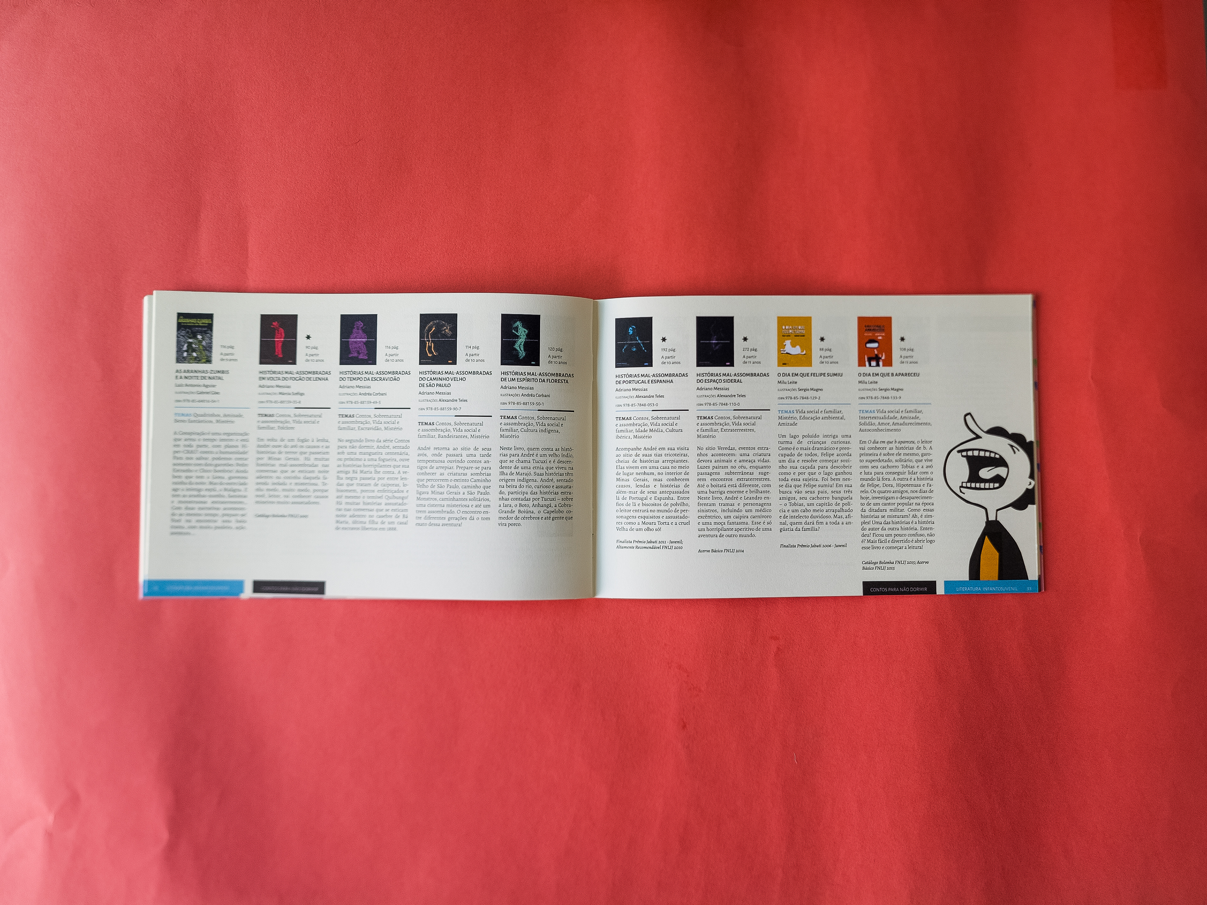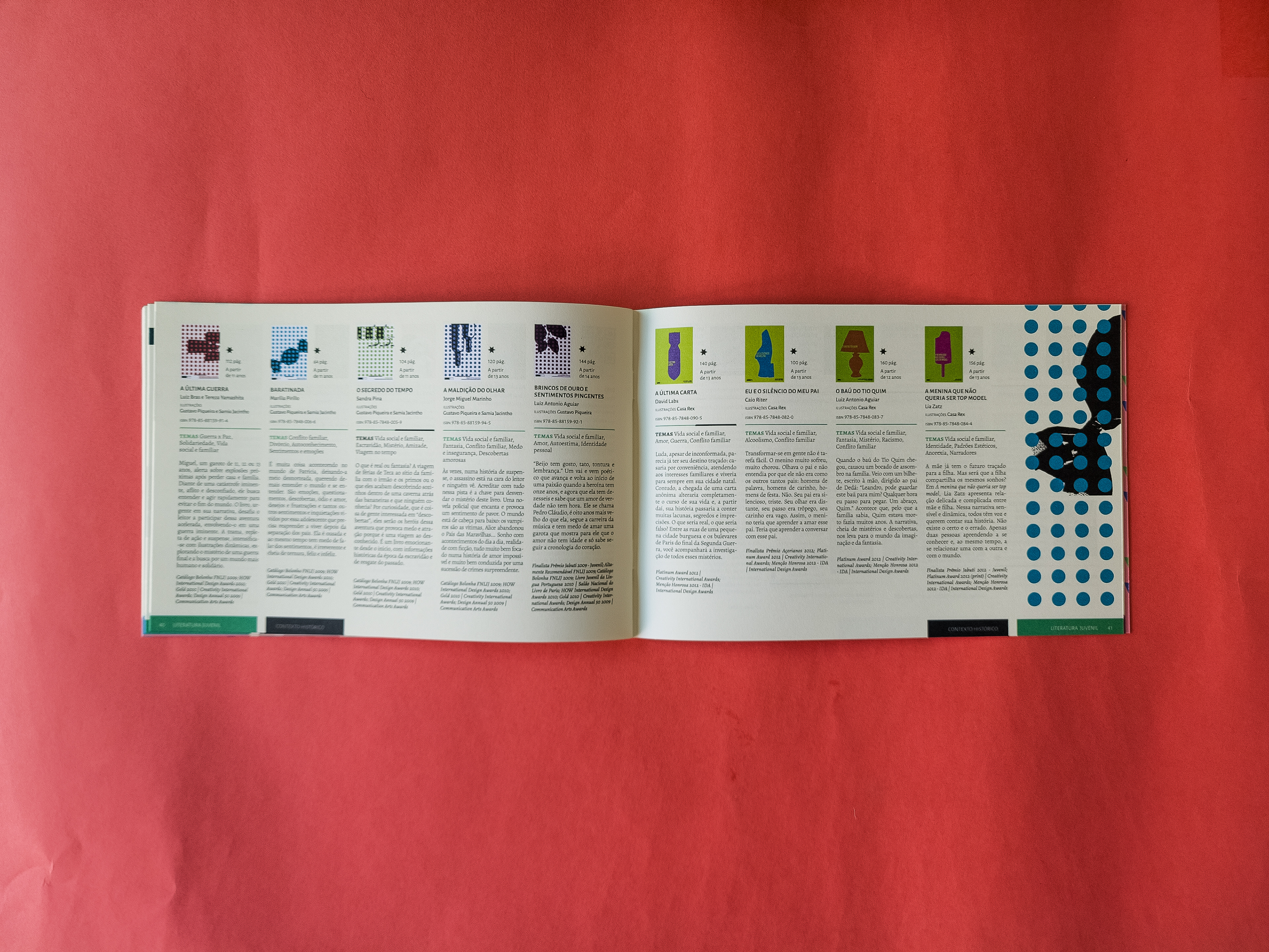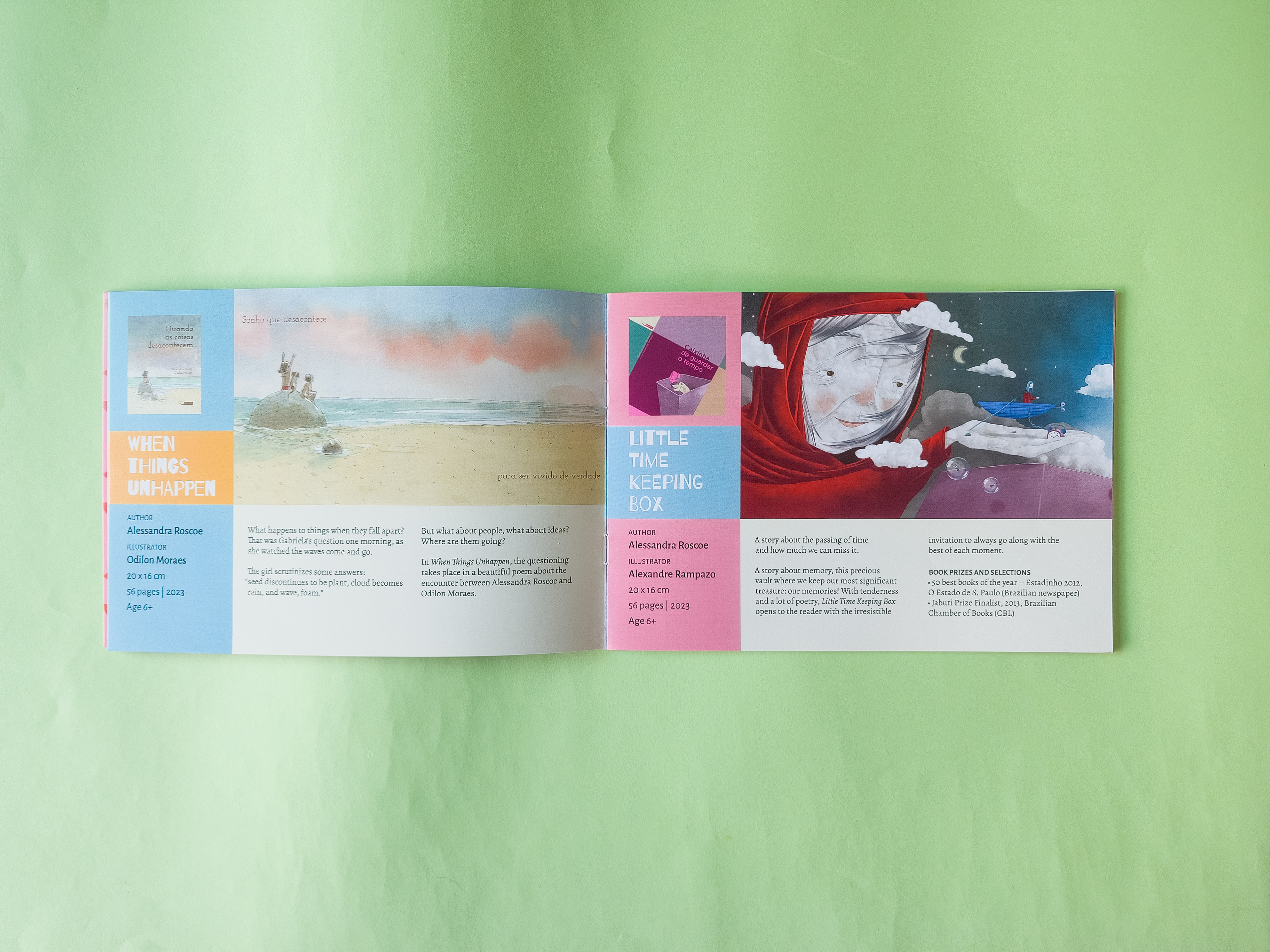 During my time as a graphic designer for Biruta and Gaivota publishing houses, I was challenged with producing their main catalogs, each with its own unique specifications and limitations. The first, featuring titles published in Brazil, needed to fit a large number of publications into a limited number of pages. The second, for selling rights to foreign publishers, had to include synopses and showcase titles translated into English. The result was a pair of A5-sized printed catalogs full of “Biruta” quirks and charms.