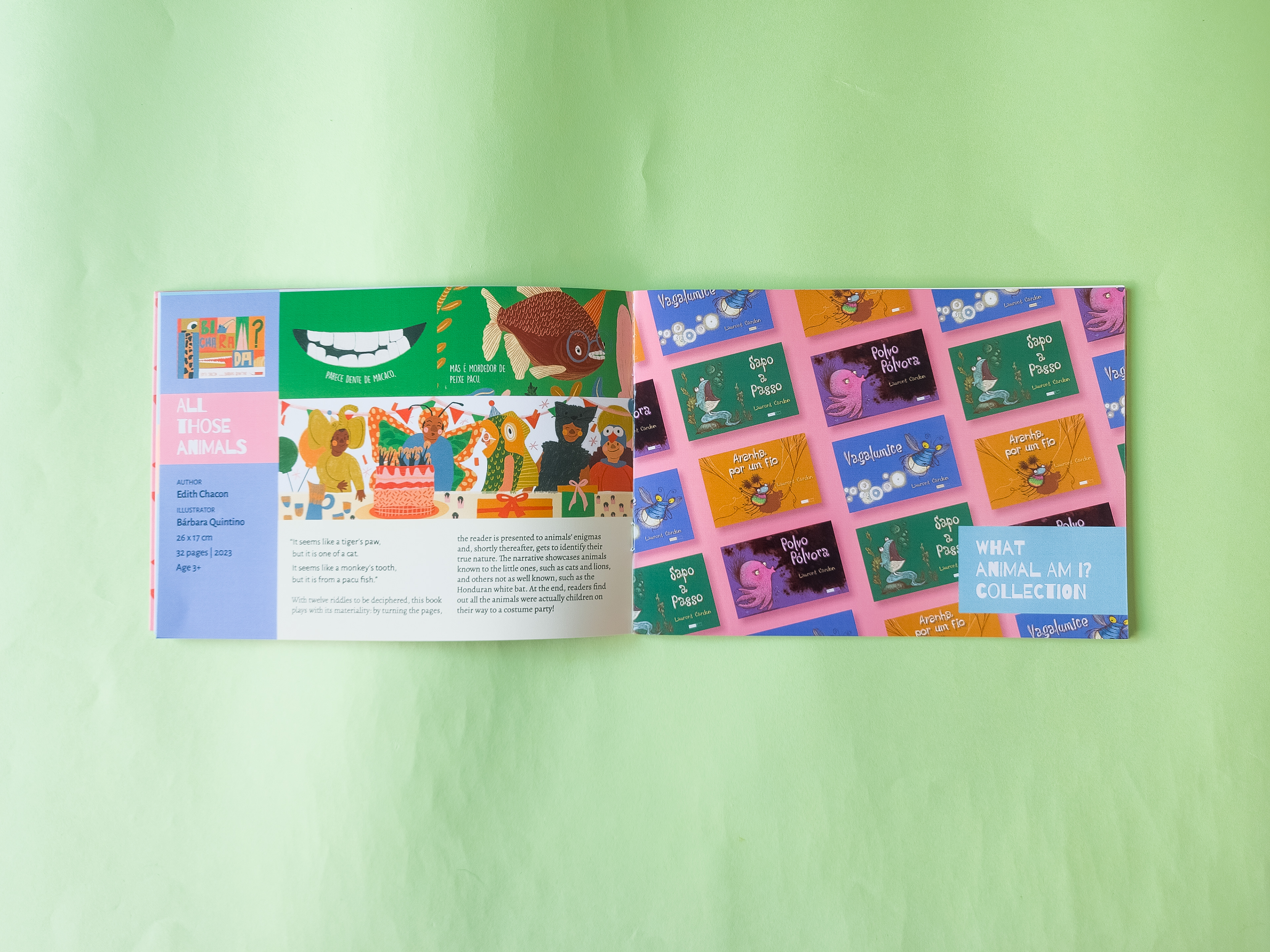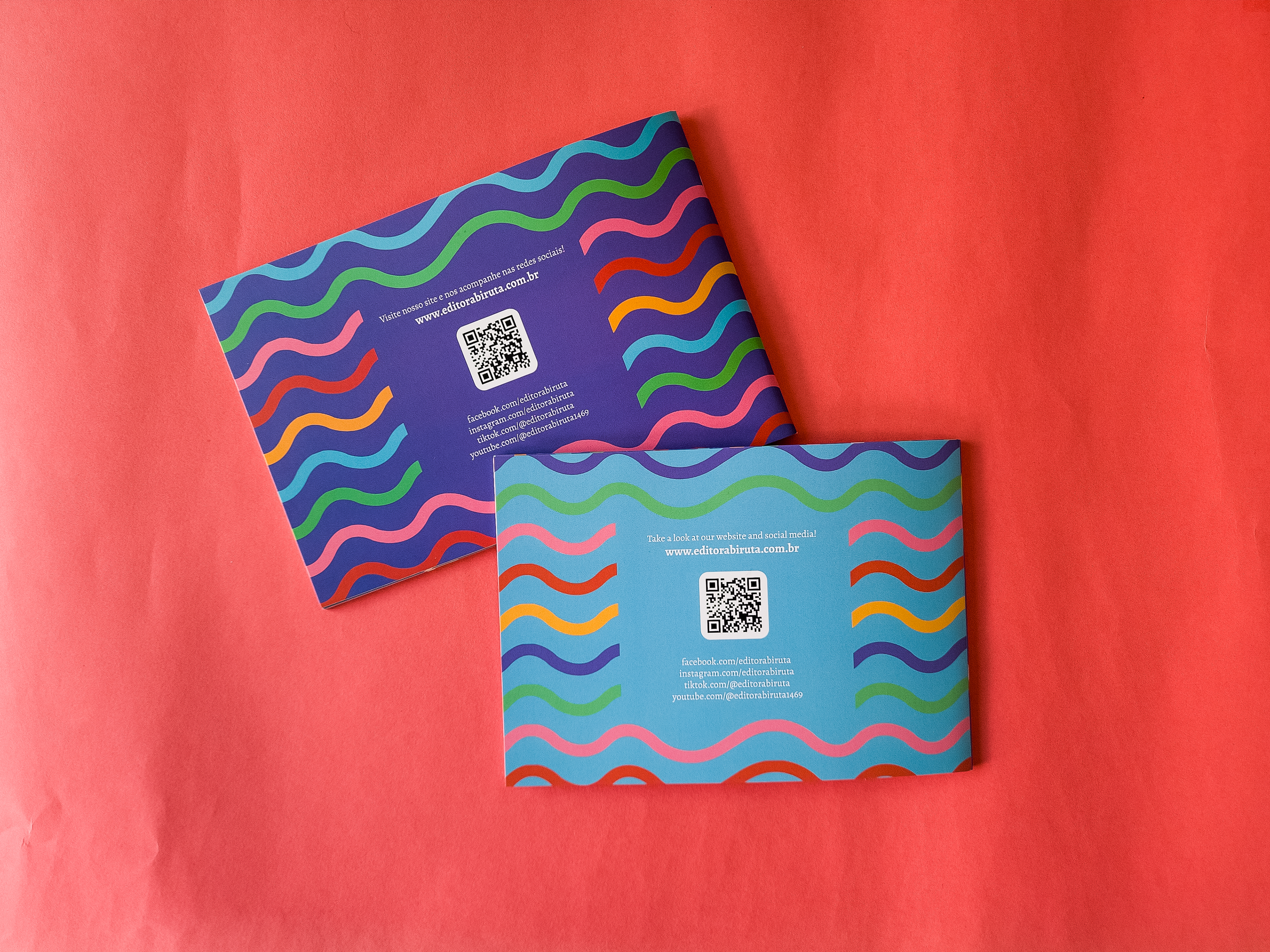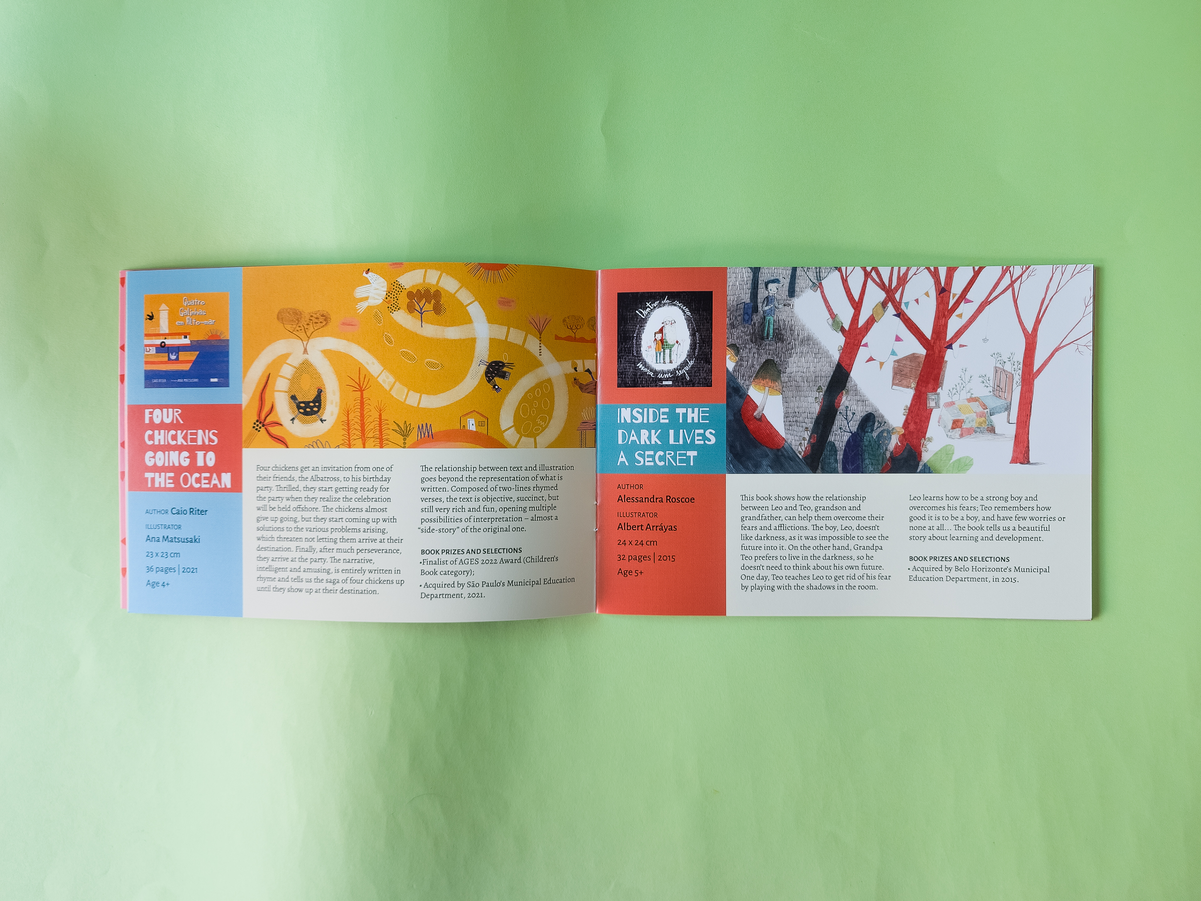 During my time as a graphic designer for Biruta and Gaivota publishing houses, I was challenged with producing their main catalogs, each with its own unique specifications and limitations. The first, featuring titles published in Brazil, needed to fit a large number of publications into a limited number of pages. The second, for selling rights to foreign publishers, had to include synopses and showcase titles translated into English. The result was a pair of A5-sized printed catalogs full of “Biruta” quirks and charms.