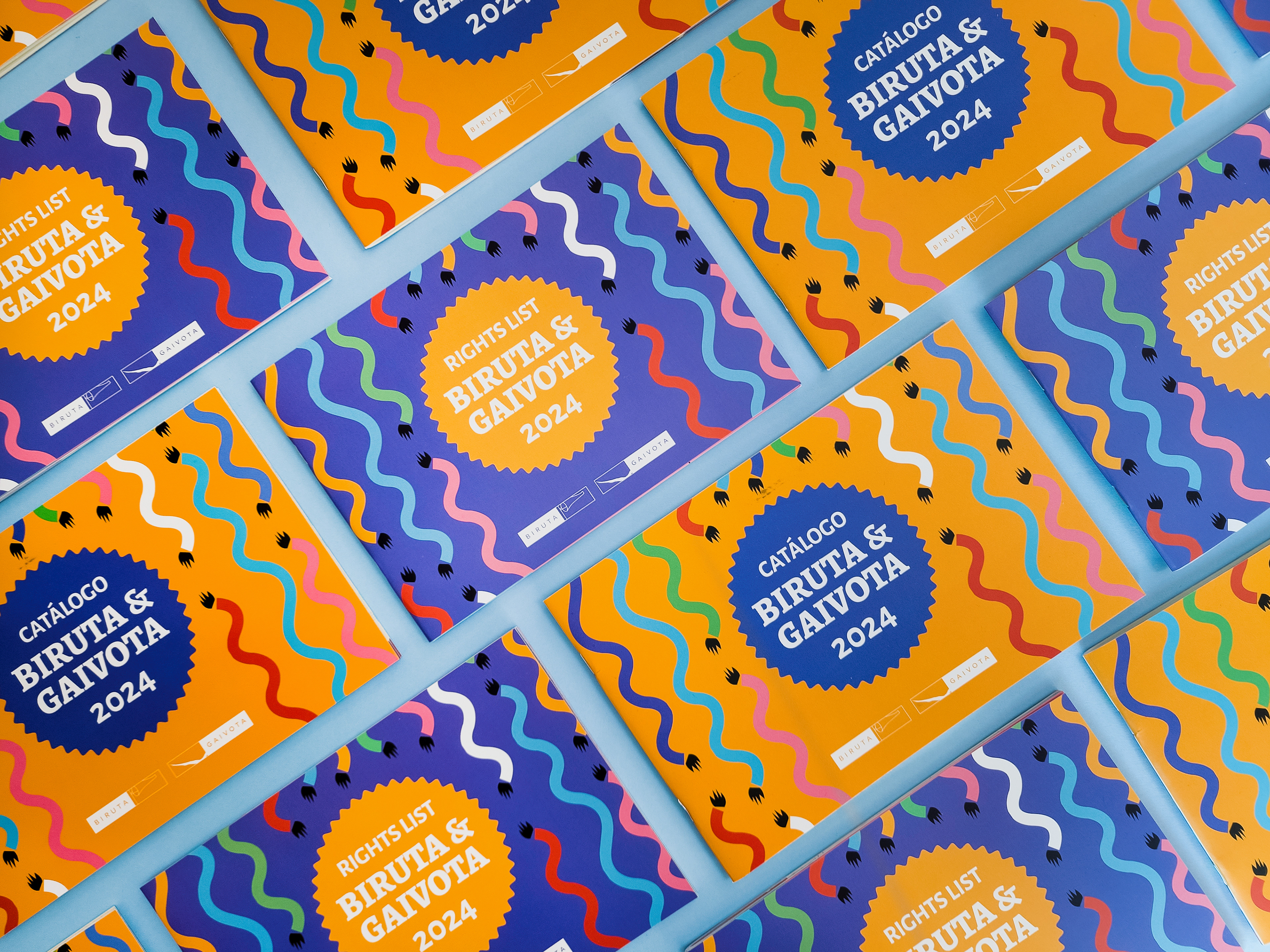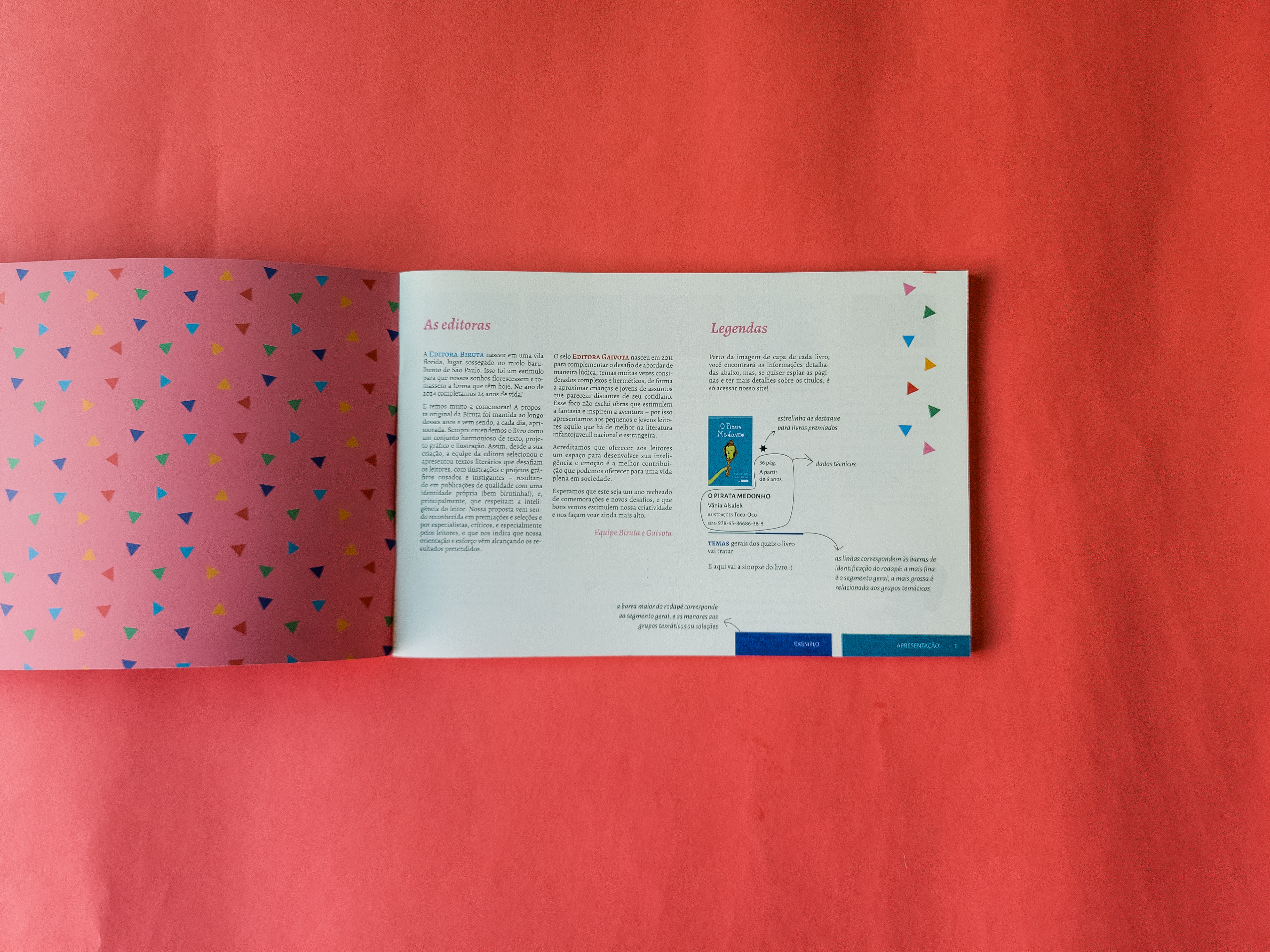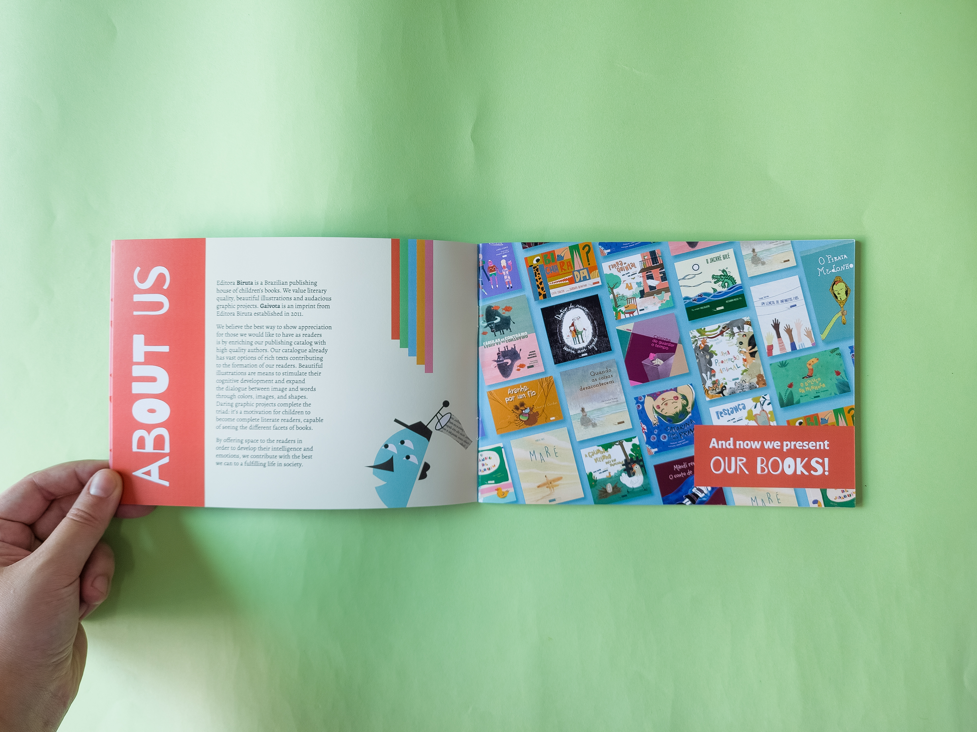 Durante minha atuação como designer gráfico das editoras Biruta e Gaivota, tive o desafio de produzir seus principais catálogos, cada um com suas especificidades e limitações. O primeiro, de títulos publicados no Brasil, precisava abarcar um número grande de publicações em um espaço limitado de páginas, enquanto o segundo, de venda de direitos para editoras estrangeiras, precisava contar as sinopses e mostrar os títulos traduzidos para a língua inglesa. O resultado foi uma dupla de catálogos impressos em tamanho a5 cheio de birutices.