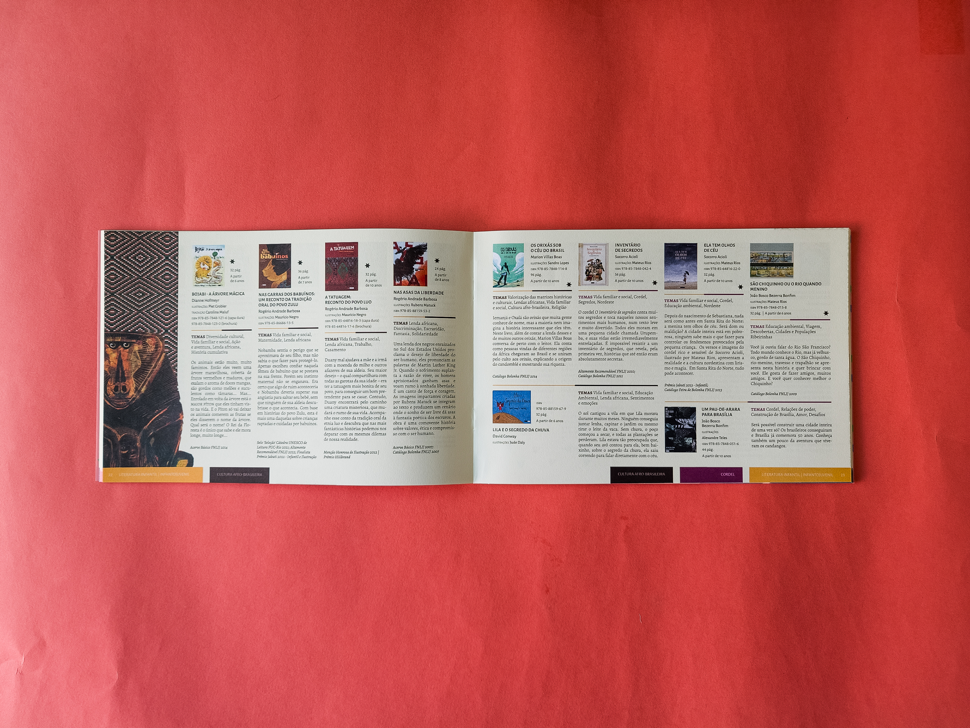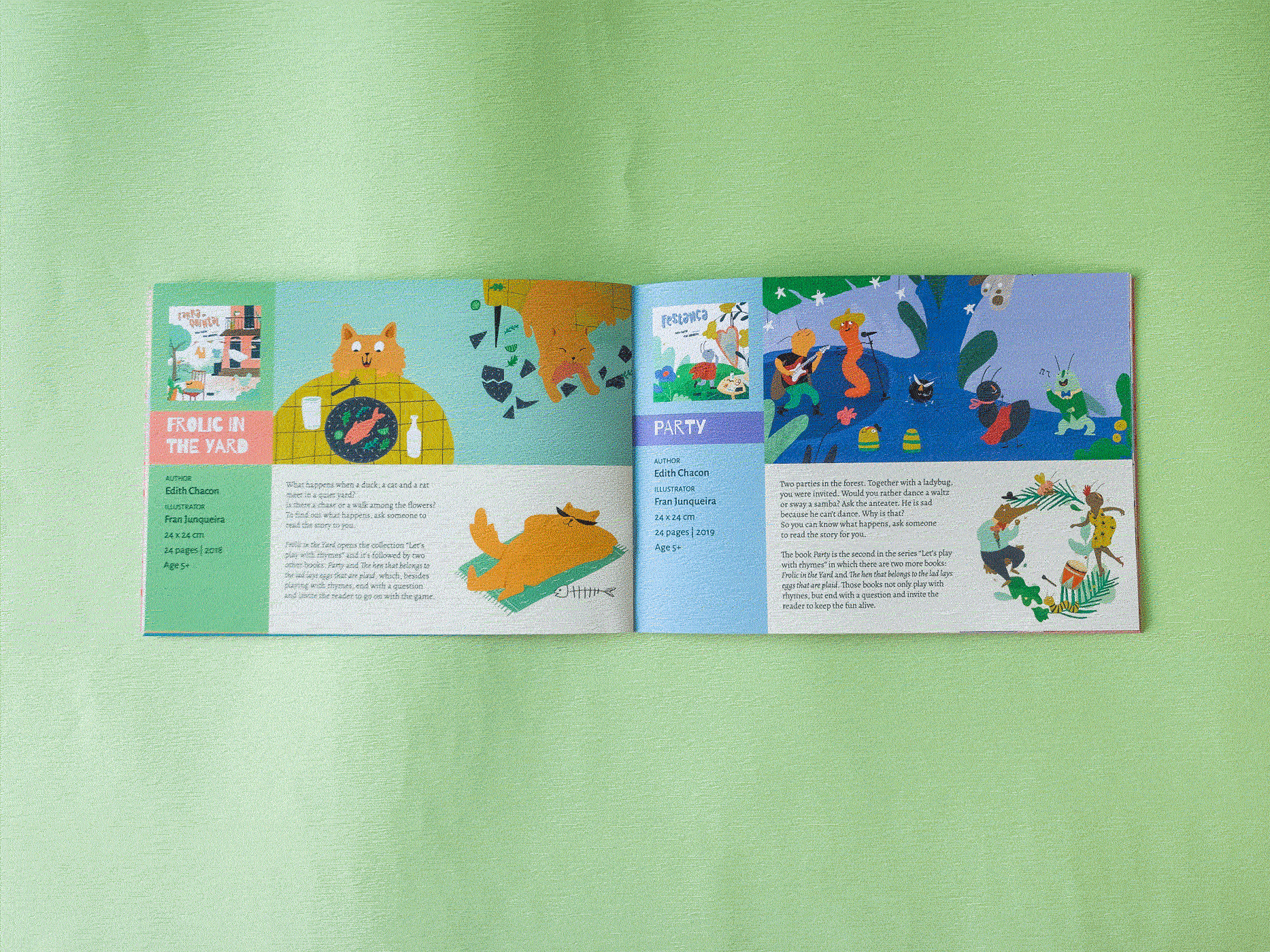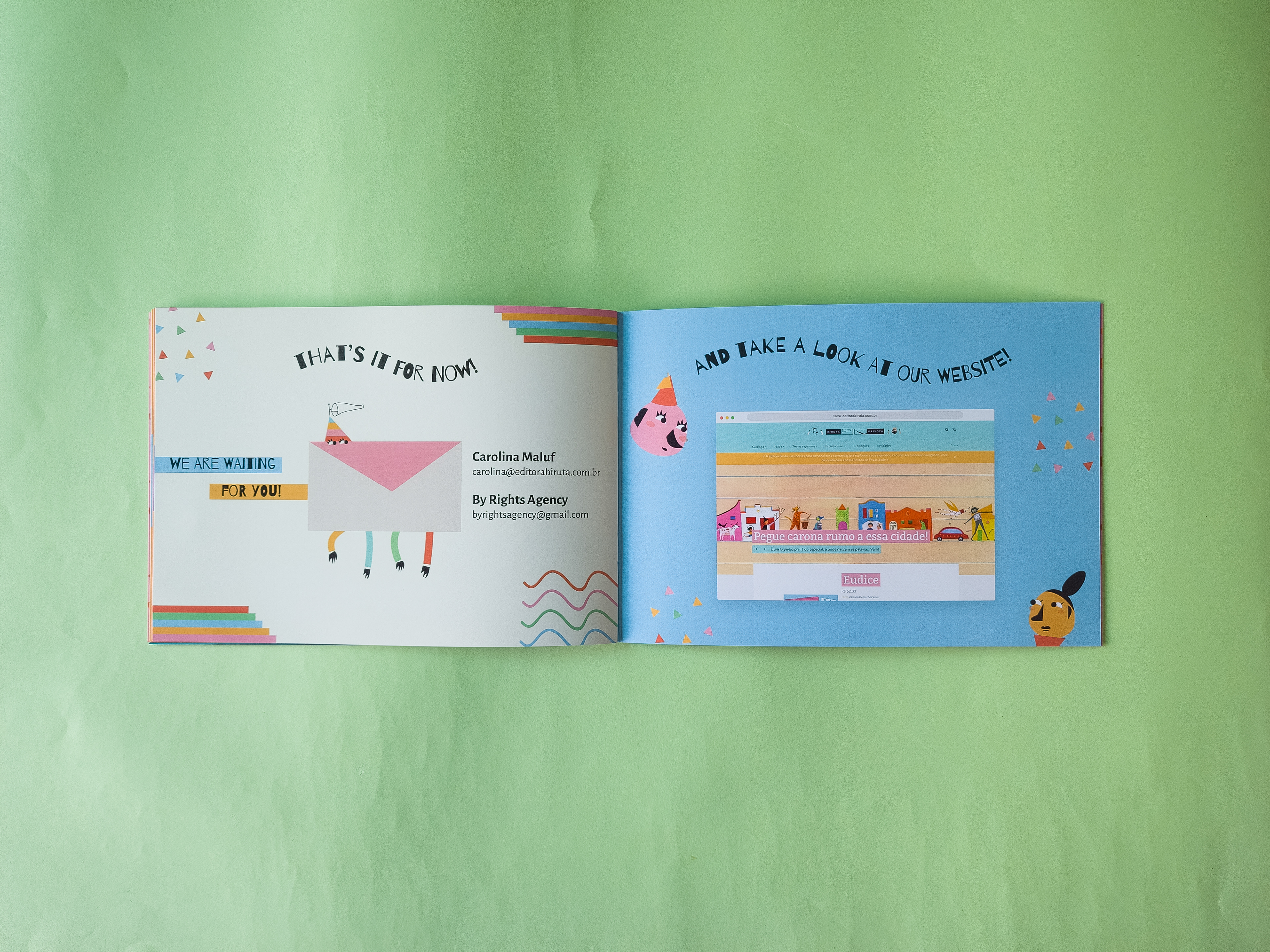 Durante minha atuação como designer gráfico das editoras Biruta e Gaivota, tive o desafio de produzir seus principais catálogos, cada um com suas especificidades e limitações. O primeiro, de títulos publicados no Brasil, precisava abarcar um número grande de publicações em um espaço limitado de páginas, enquanto o segundo, de venda de direitos para editoras estrangeiras, precisava contar as sinopses e mostrar os títulos traduzidos para a língua inglesa. O resultado foi uma dupla de catálogos impressos em tamanho a5 cheio de birutices.
