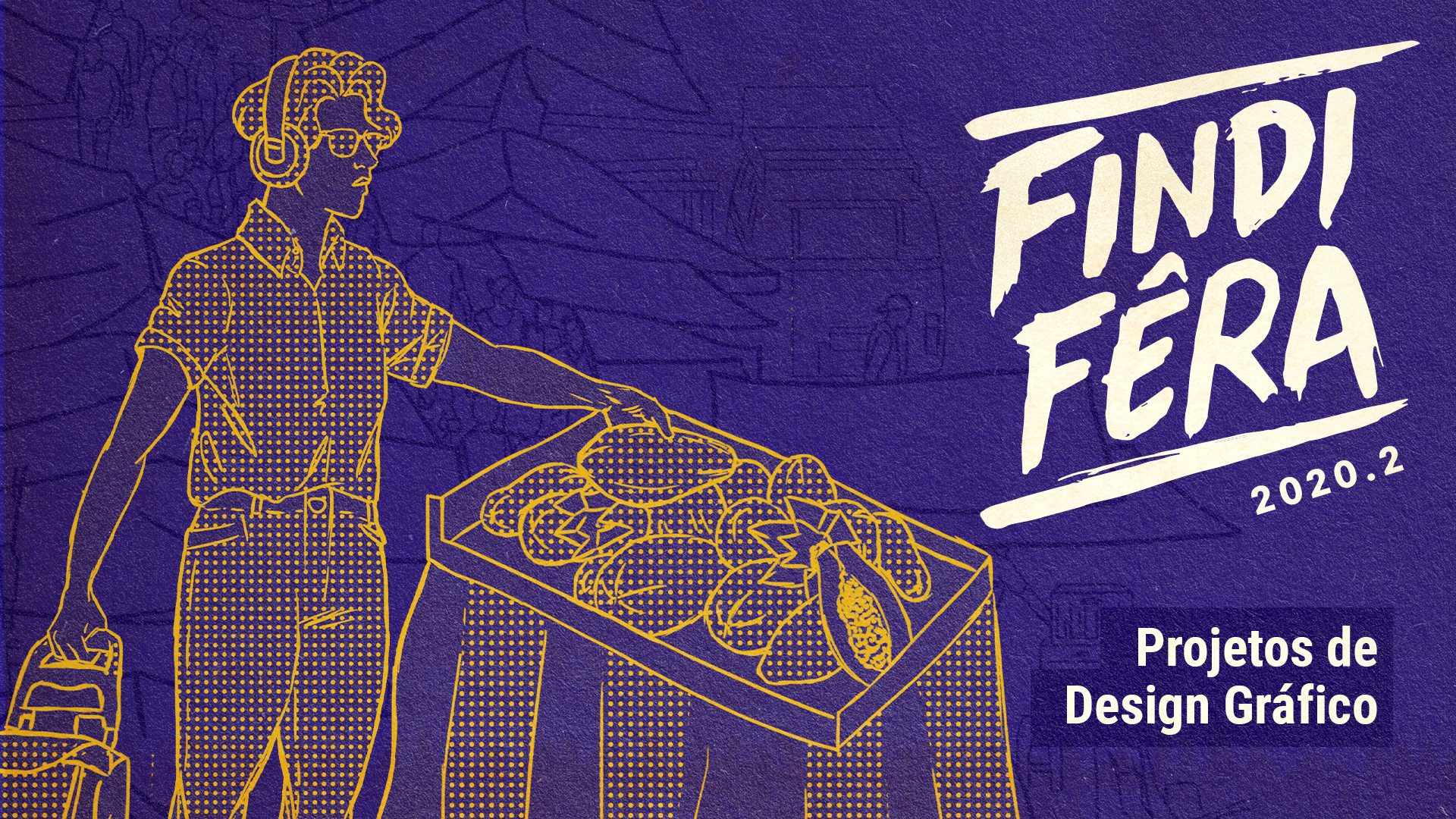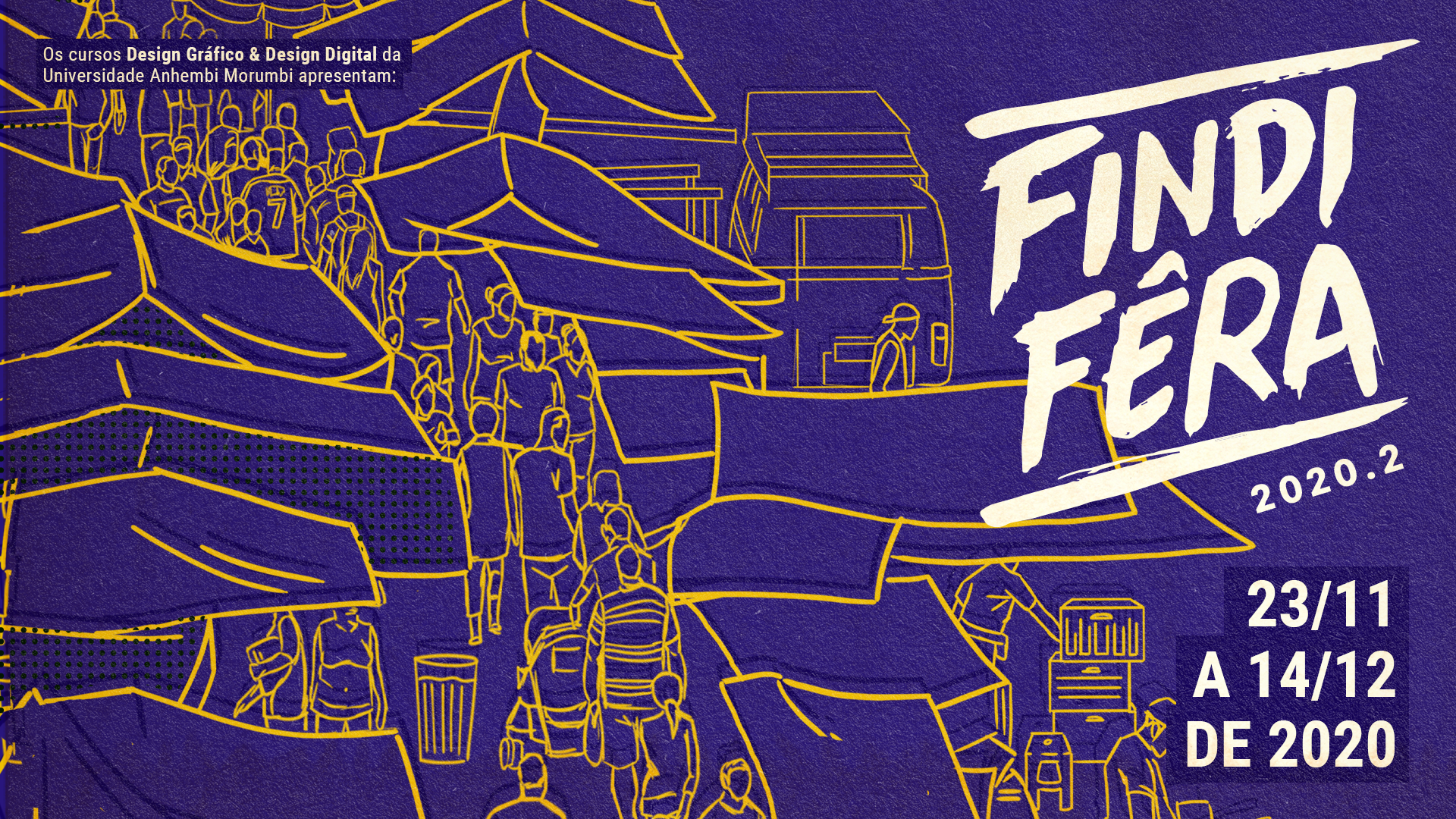 decorrer do semestre. Para o segundo semestre de 2020 a abordagem foi um pouco diferente. Após mais um semestre intenso e cansativo também em formato remoto, desenvolvemos a identidade do evento de fim de semestre pensando na nostalgia das feiras de rua, muito características de São Paulo.