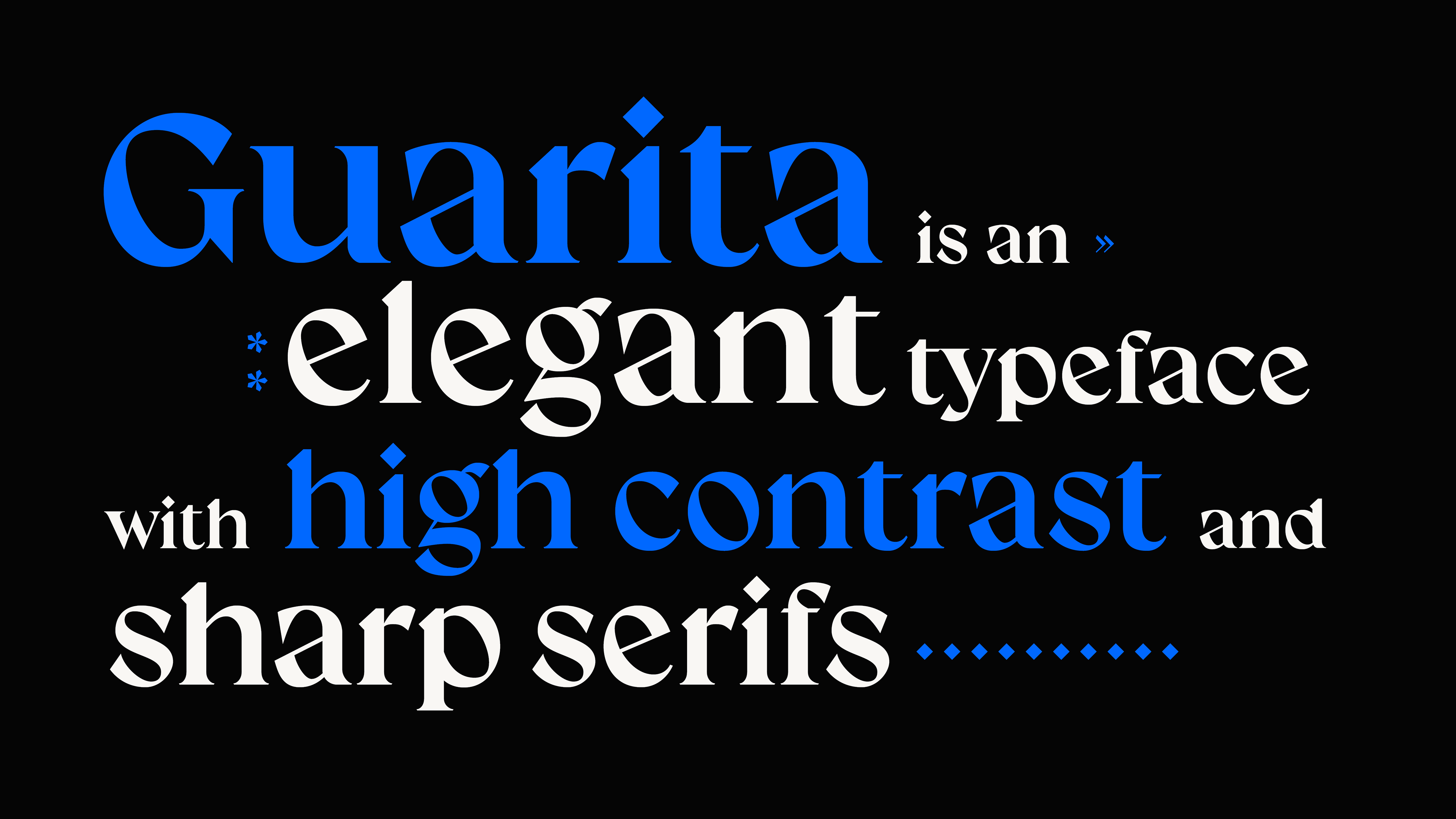 Guarita Serif is a display typeface, with high translation contrast, designed with the aim of trying to extrapolate the limits of the x-height and still manage to hurt with its sharp serifs elegantly. It's typeset covers the latin basics, inspired in German serifs from around the turn of the 19th-20th century. Rough without being rude, loud without scream.