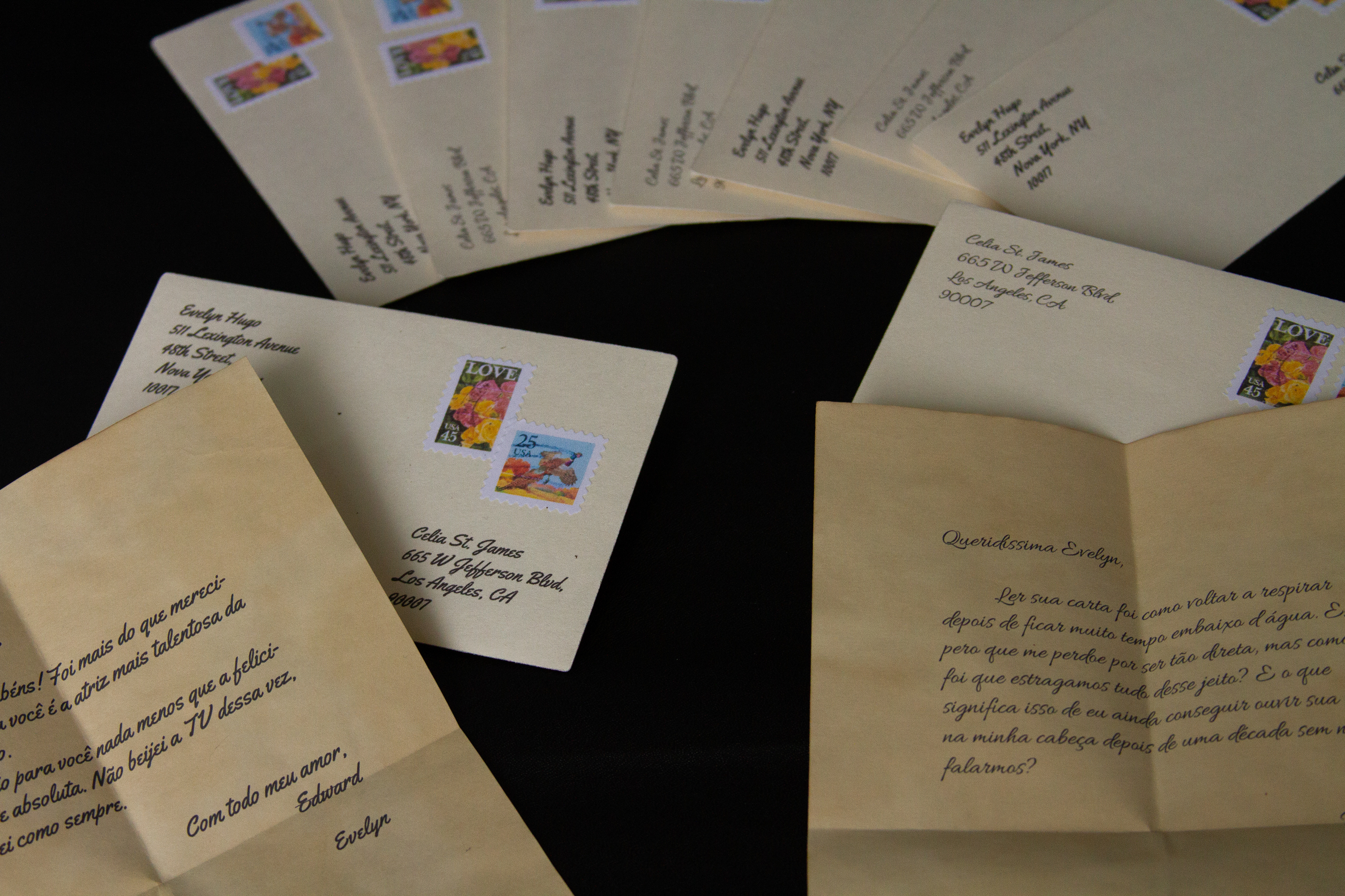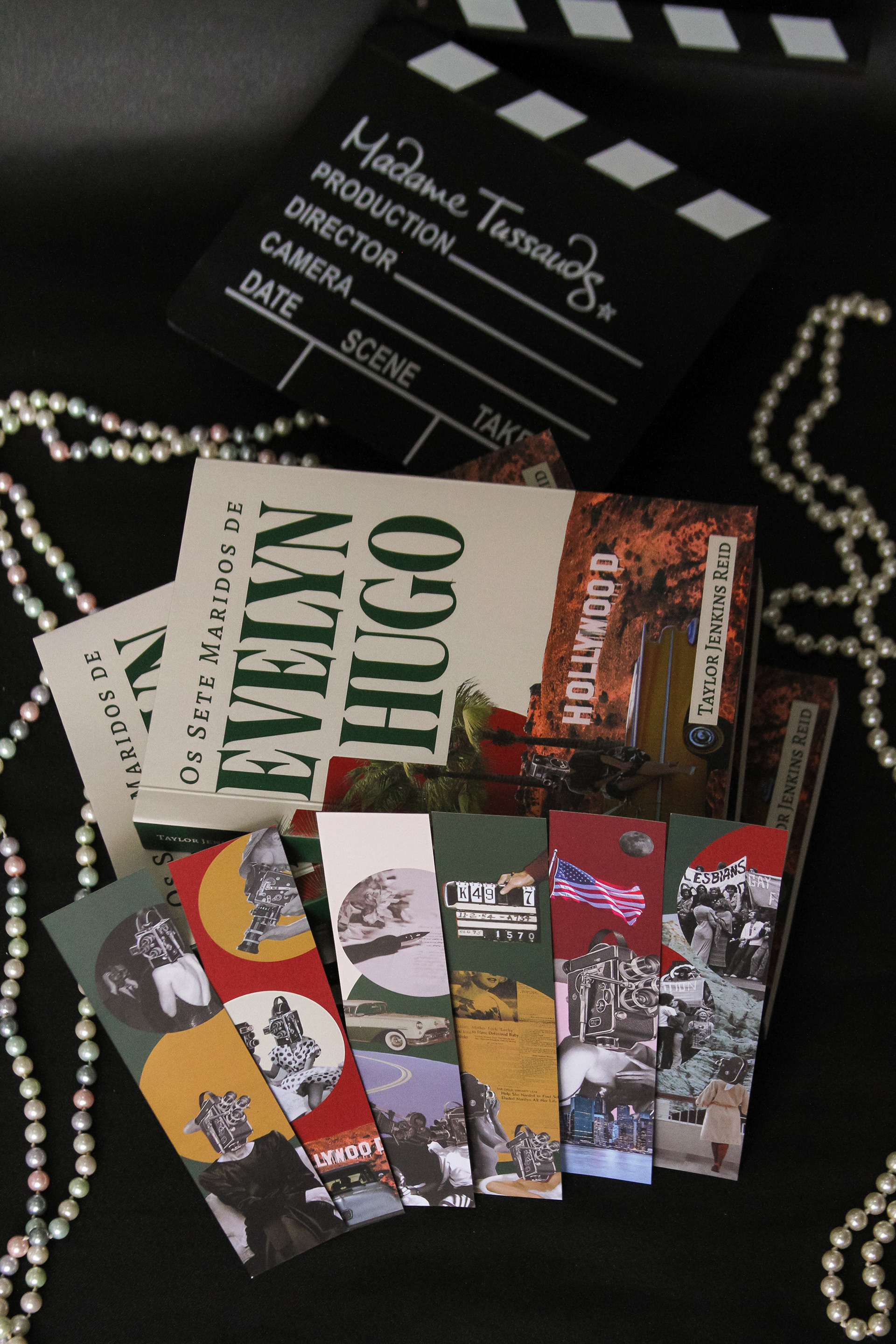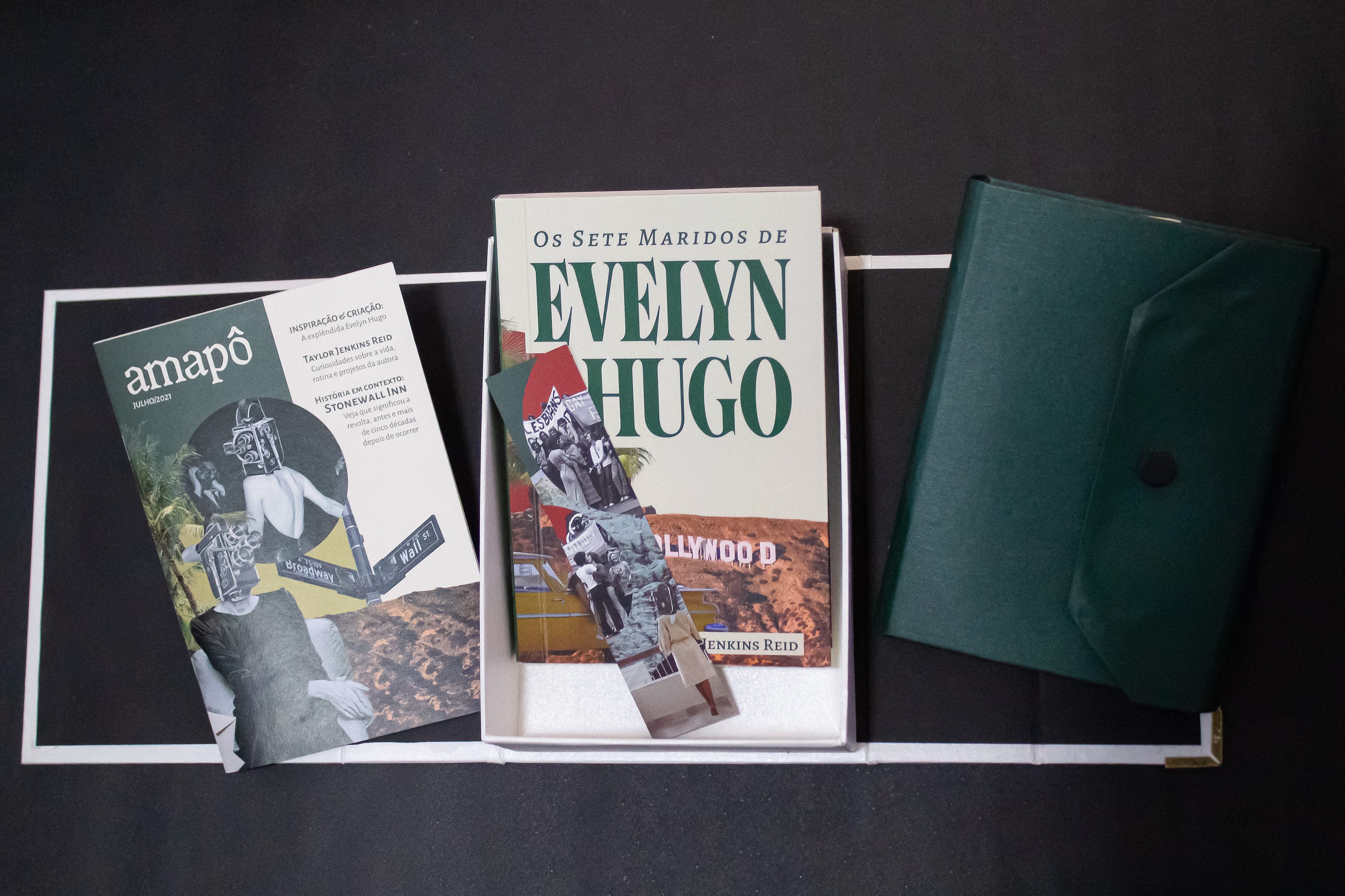 The group developed a graphic project that brought references to the most striking features of the story, relating it to the story of LGBTQIA+ rights, an important part of the plot. It focused mainly on comfort reading, in understanding the changes in the narrative point of view and translating creative concepts (glamour, 1960s and spectacle) both in the literary book graphic design and in the development of the other items in the kit. The object book worked with specific items from the book's plot, bringing all the letters and souvenirs that the protagonist would have kept for herself, and the information booklet was composed of texts translated by members of the group dealing with the life and work of the author, the story of the LGBTQIA+ rights and the real-life actresses who would have inspired the creation of Evelyn Hugo.