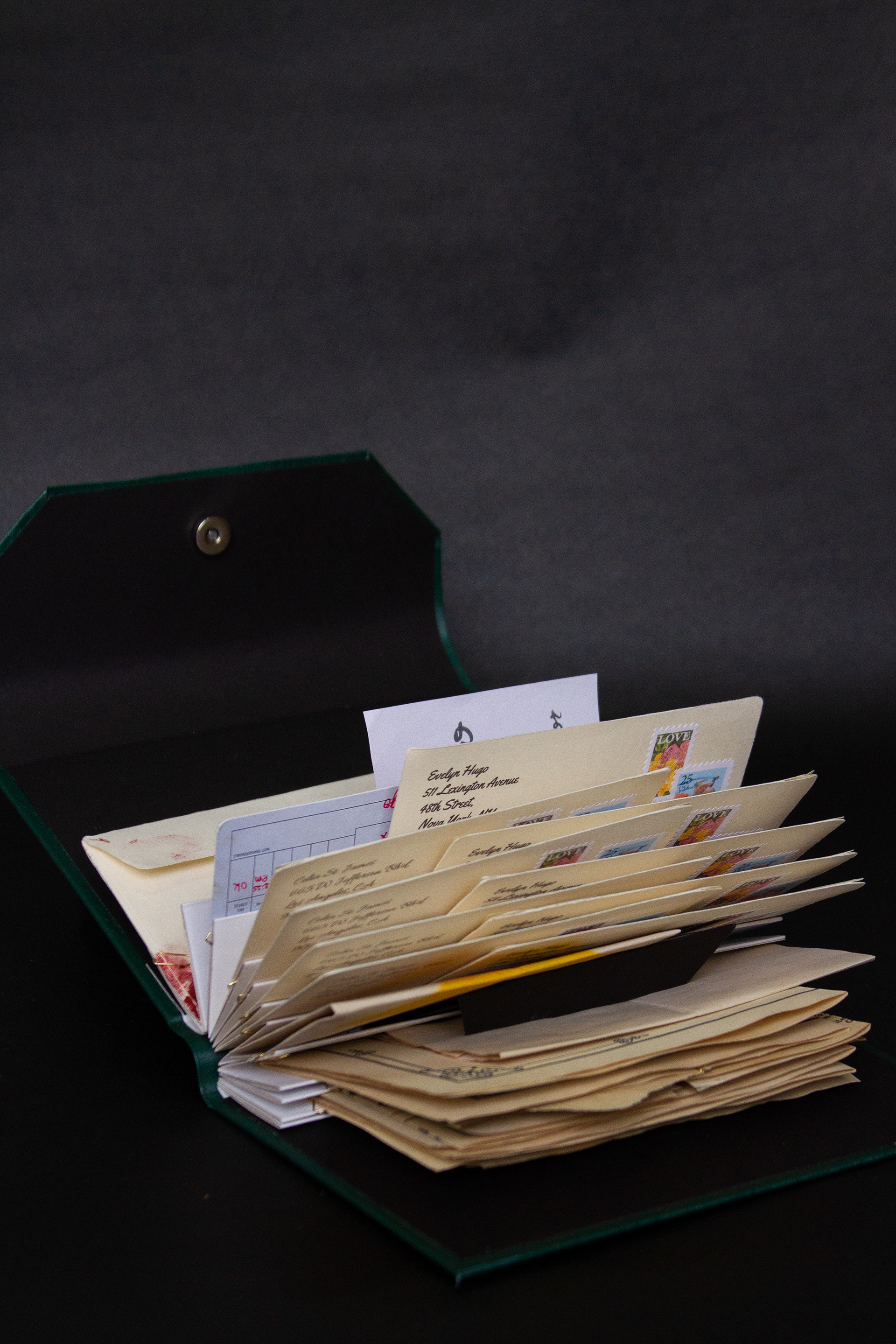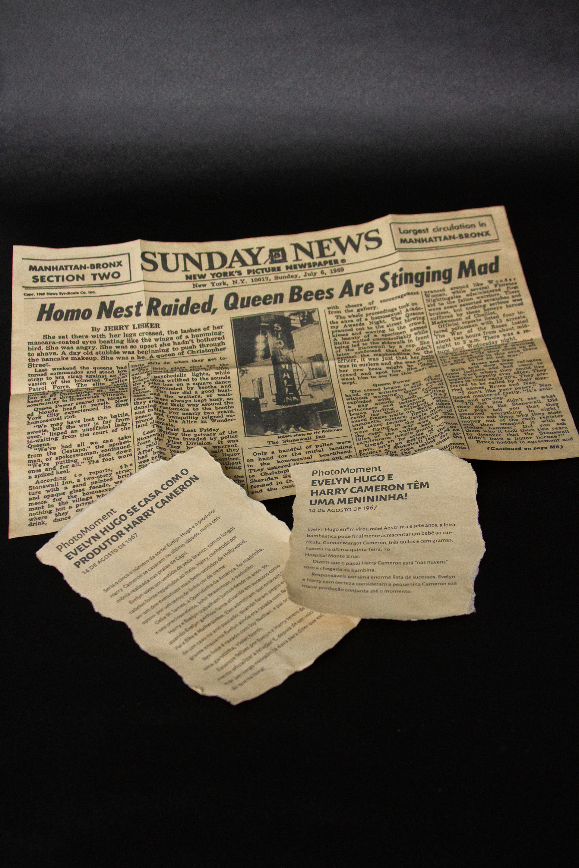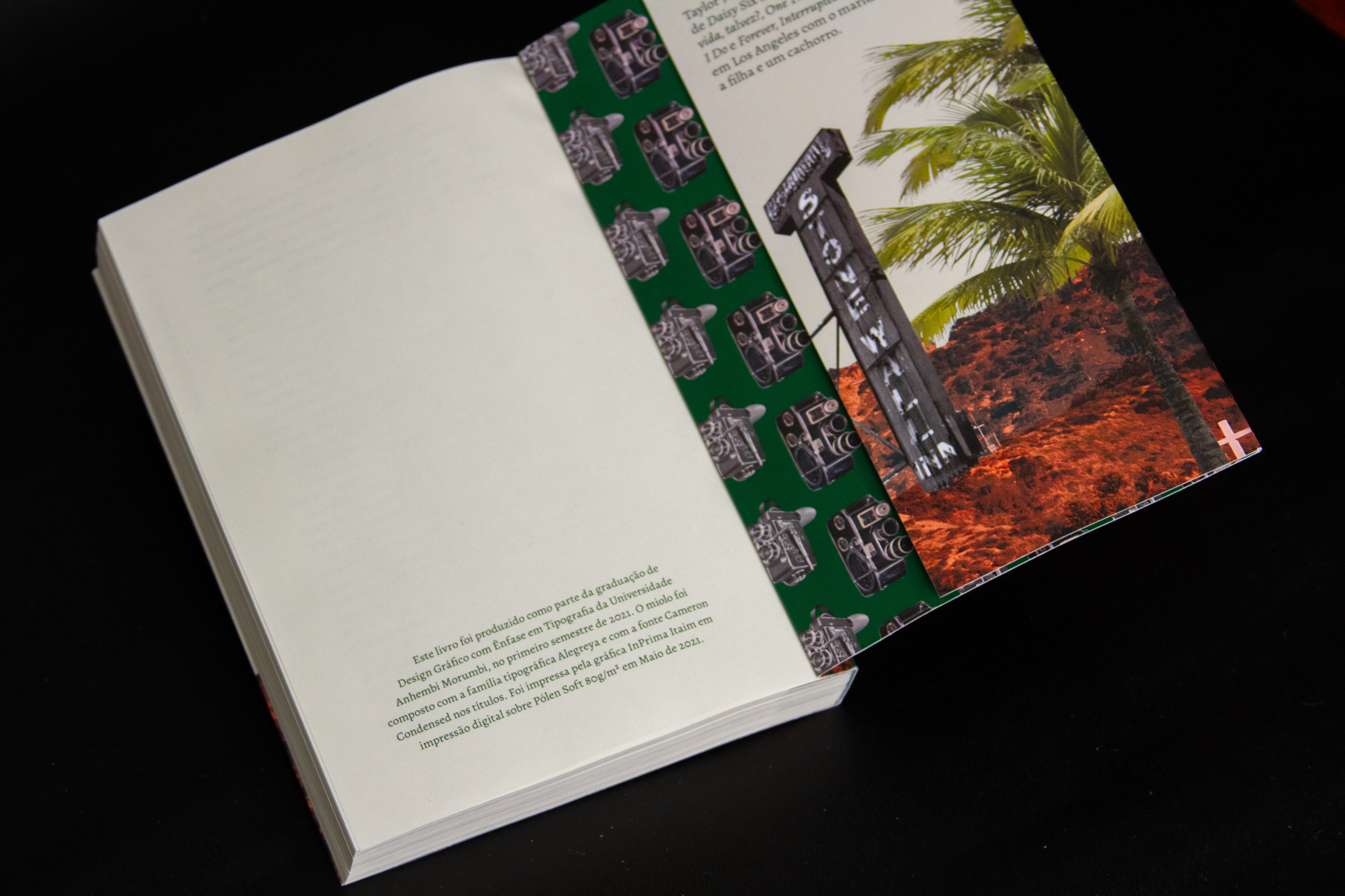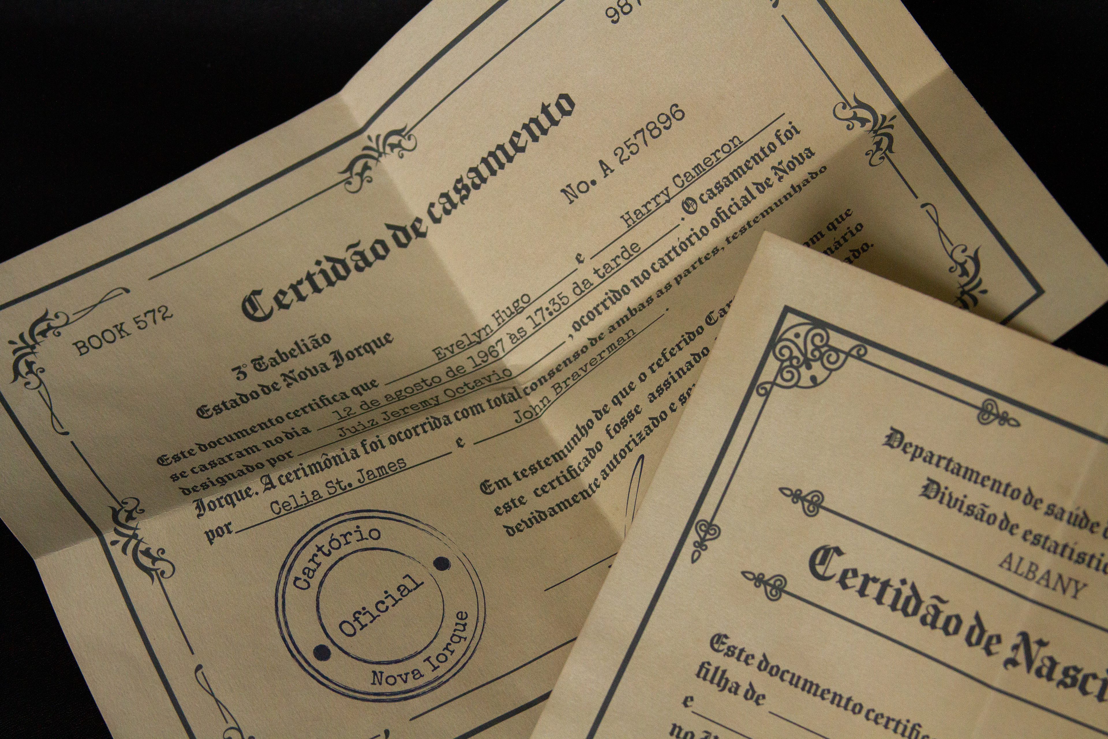 The group developed a graphic project that brought references to the most striking features of the story, relating it to the story of LGBTQIA+ rights, an important part of the plot. It focused mainly on comfort reading, in understanding the changes in the narrative point of view and translating creative concepts (glamour, 1960s and spectacle) both in the literary book graphic design and in the development of the other items in the kit. The object book worked with specific items from the book's plot, bringing all the letters and souvenirs that the protagonist would have kept for herself, and the information booklet was composed of texts translated by members of the group dealing with the life and work of the author, the story of the LGBTQIA+ rights and the real-life actresses who would have inspired the creation of Evelyn Hugo.