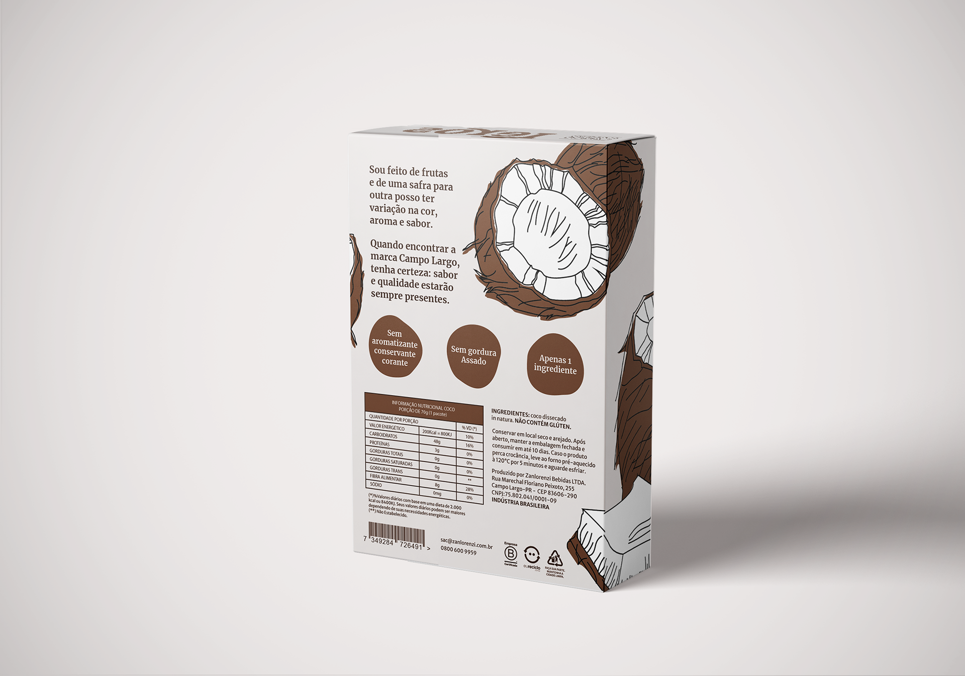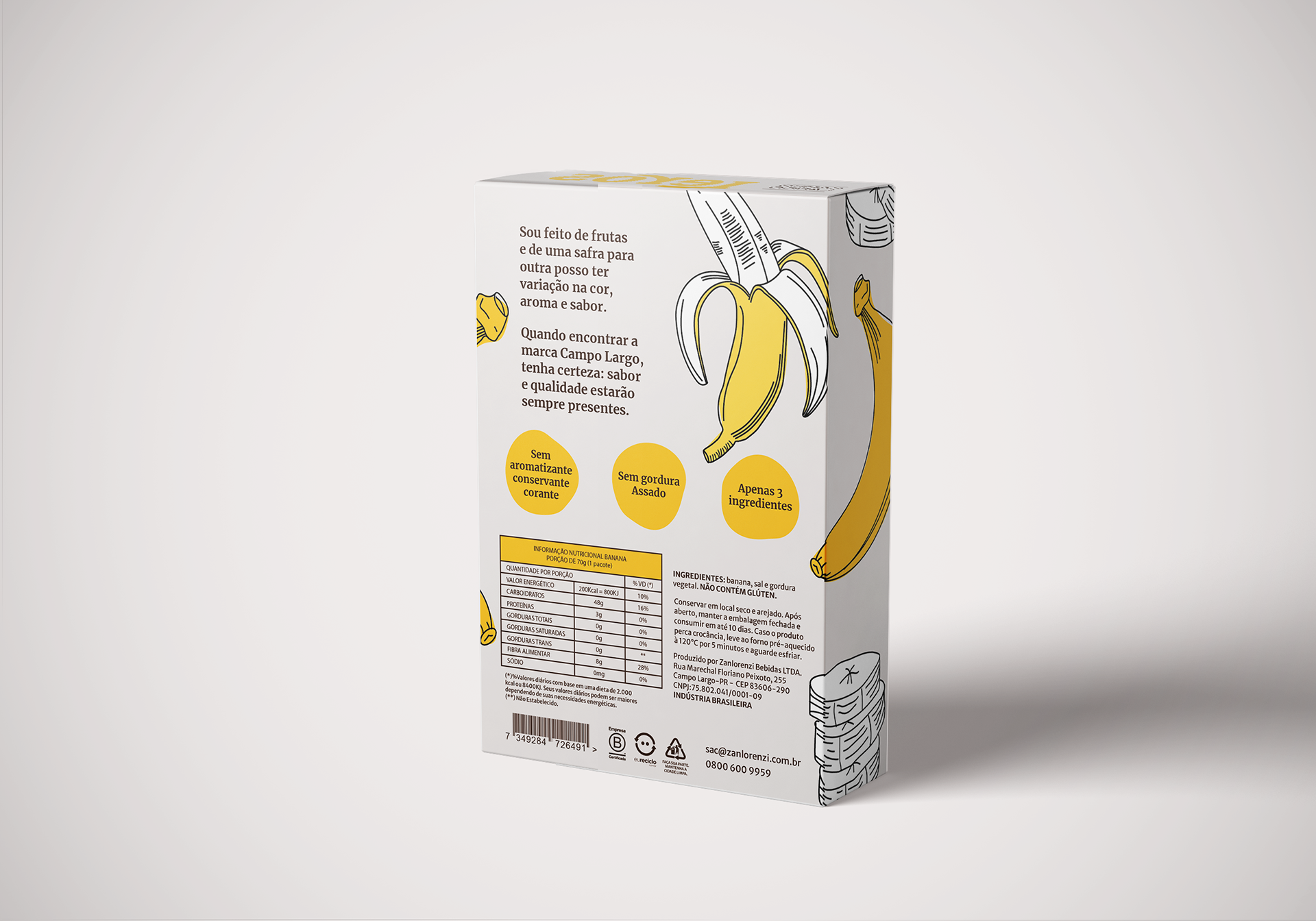 O uso de papelão, papel paraná e plásticos sustentáveis nas embalagens foi a melhor alternativa encontrada para a proposta do projeto, a de beneficiar não só as pessoas consumindo o produto, mas como também ajudar o meio ambiente.